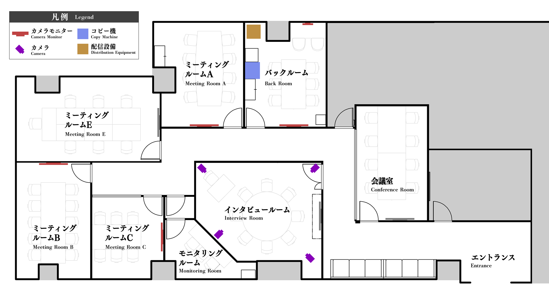 ※インタビュールーム、バックルーム、モニタリングルームが基本貸し出しエリアです。